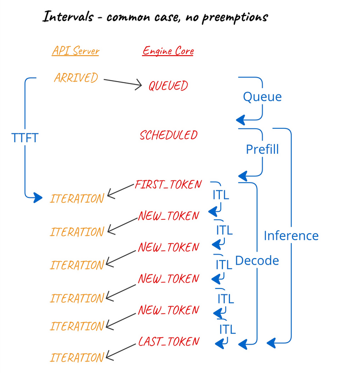 QUEUED- when the request was received by the engine core and added to the scheduler queue.SCHEDULED- when the request was first scheduled for execution.PREEMPTED- the request has been put back in the waiting queue in order to make room for other requests to complete. It will be re-scheduled in future and re-start its prefill phase.NEW_TOKENS- when the output included inEngineCoreOutputwas generated. Since this is common to all requests in a given iteration, we use a single timestamp onEngineCoreOutputsto record this event.